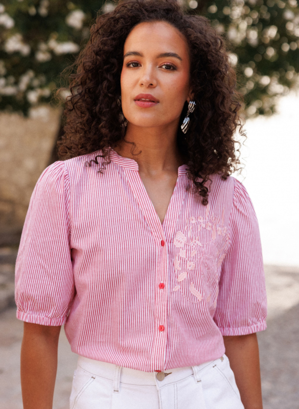 OverzichtEen frisse blouse met subtiele details. Gaja is gemaakt van luchtig katoen met een fijne streep en heeft een rond halsje met kleine V-opening. De mouwen hebben een lichte pof en elastiek in de manchetten. Verkrijgbaar in een rood en in een blauw streepje.